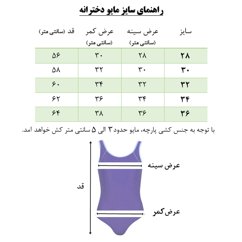 انتخاب پارچهی مناسب برای دوخت مایو بسیار مهم است. حتما شما هم دوست ندارید که وقتی وارد آب میشوید بدنتان از زیر پارچه مشخص باشد یا لباس آنقدر سنگین شود که نتوانید تکان بخورید. یا بدتر از آن، وقتی پارچه با آب تماس پیدا میکند کوچک شود و مایوی شما تبدیل به مایوی تنگ و کوچک شود! در صورتی که از جدول راهنمای سایز، سایز صحیح انتخاب شود منجر به یک تجربه شنای لذت بخش و همچنین زیبایی ظاهری و افزایش اعتماد به نفس شما خواهد شد. لازم به ذکر است بندهای این مایو قابل تنظیم بوده و یک الی دو سایز (قد یا ارتفاع مایو) قابل تغییر می باشد.